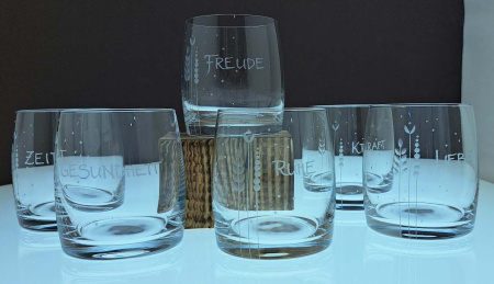 Wasserglas mit handgraviertem Begriff – wahlweise "Zeit", "Freude", "Gesundheit", "Ruhe", "Kraft", "Liebe"; Mattes Schriftbild direkt ins Glas geschnitten, jedes Stück ein Unikat.