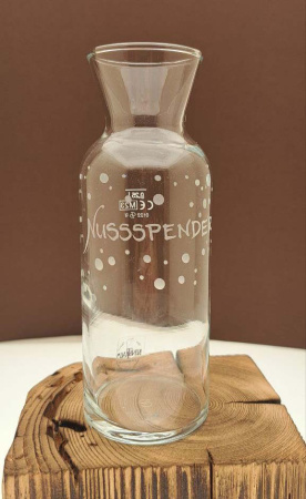 Karaffe 1 l ohne Henkel mit handgraviertem Spruch (z. B.:„Träume nicht dein Leben, sondern lebe deinen Traum“) und dezentem Kugelmuster. Ideal als Tischkaraffe.