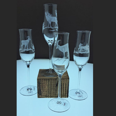 Edles Schnapsglas (Kelch) mit handgraviertem Jagdmotiv – matter Schliff direkt im Glas. Motivauswahl z. B. Hirsch, Gams, Steinbock, Fuchs, Auerhahn, Rehbock; Jedes Stück ein Unikat.