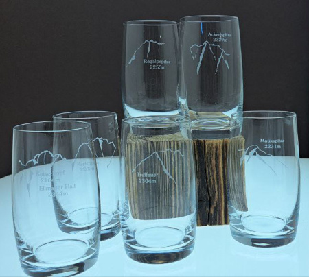 Wassergläser-Set „Südberge“ (7-tlg.): Auf jedem Glas ein sandgestrahlter Gipfel inkl. Höhenmeter – Schützkogel, Gamshag, Tristkogel, Sonnspitze, Saalkogel und Rauber und Staffkogel.