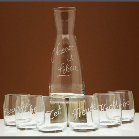 7-tlg. Wassergarnitur: Y-Karaffe mit handgraviertem „Wasser ist Leben“ + 6 Gläser mit Begriffen (z. B. Zeit, Freude, Gesundheit, Ruhe, Kraft, Liebe;). Echte Handarbeit – edel und alltagstauglich.