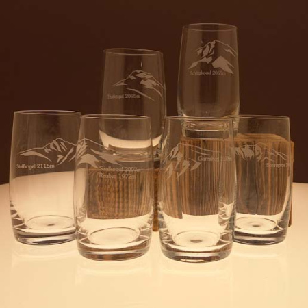 Wassergläser-Set „Südberge“ (7-tlg.): Auf jedem Glas ein sandgestrahlter Gipfel inkl. Höhenmeter – Schützkogel, Gamshag, Tristkogel, Sonnspitze, Saalkogel und Rauber und Staffkogel.