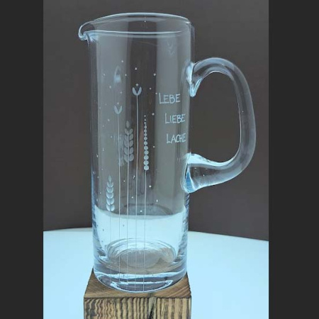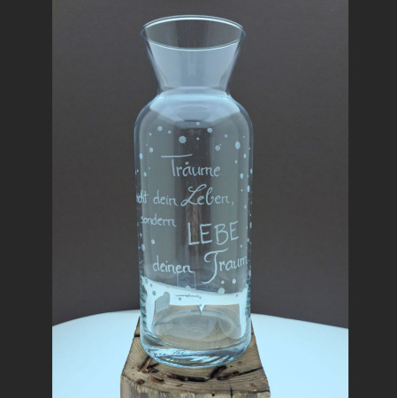 Karaffe 1 l ohne Henkel mit handgraviertem Spruch (z. B.:„Träume nicht dein Leben, sondern lebe deinen Traum“) und dezentem Kugelmuster. Ideal als Tischkaraffe.