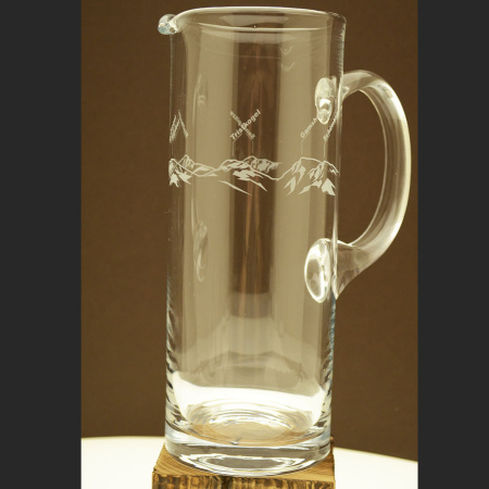 Glaskrug 1 l mit Henkel mit Ausguss, sandgestrahlt mit der Bergkette „Südberge“. Mattes Panoramamotiv direkt im Glas.
