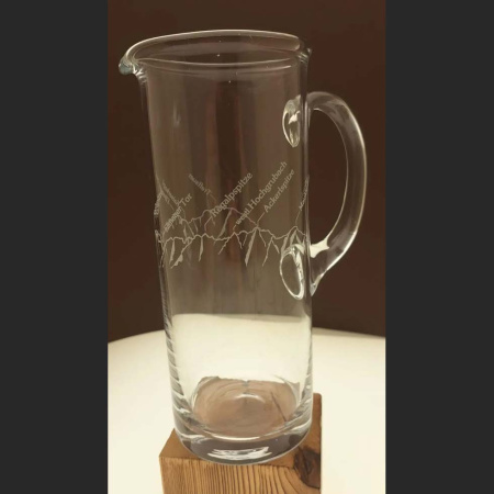 Glaskrug 1 l mit Henkel und Ausguss, handgraviert mit der Bergkette „Wilder Kaiser“. Mattes Panoramamotiv direkt im Glas – für Tisch & Alltag.